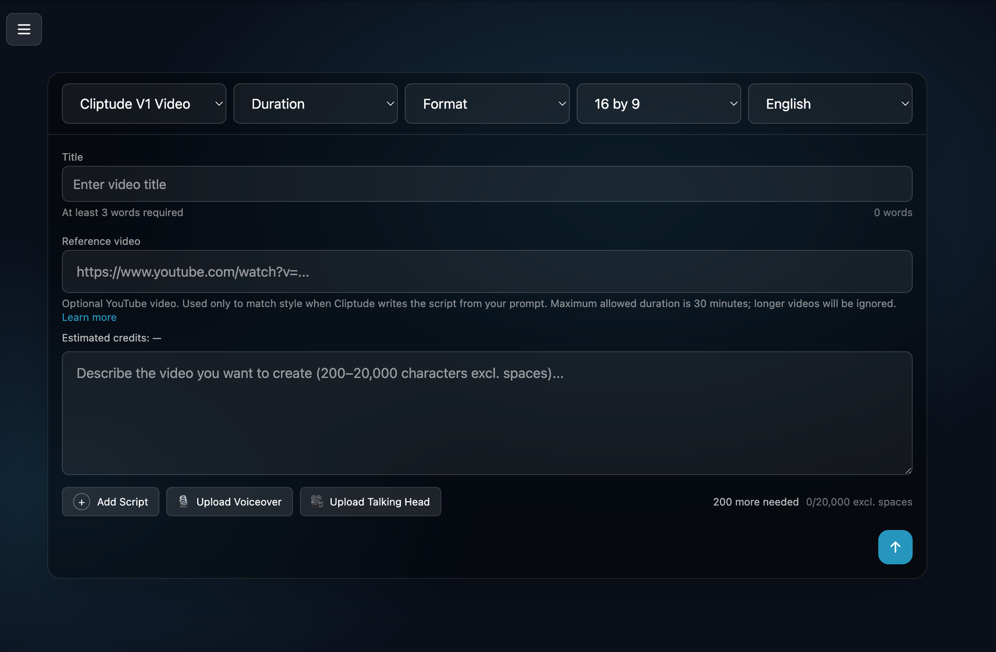 Cliptude lets you go from topic to finished video without manual editing. You provide a prompt or a script, and the platform generates the script if needed, sources footage, adds voiceovers, creates motion graphics, and exports the final video. It's a full production pipeline, not just a single AI feature.